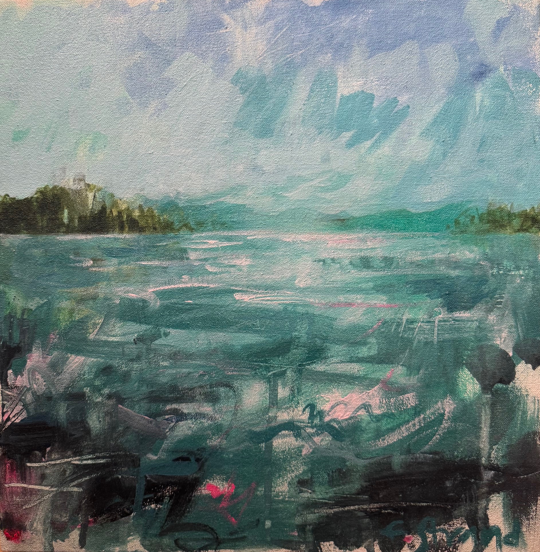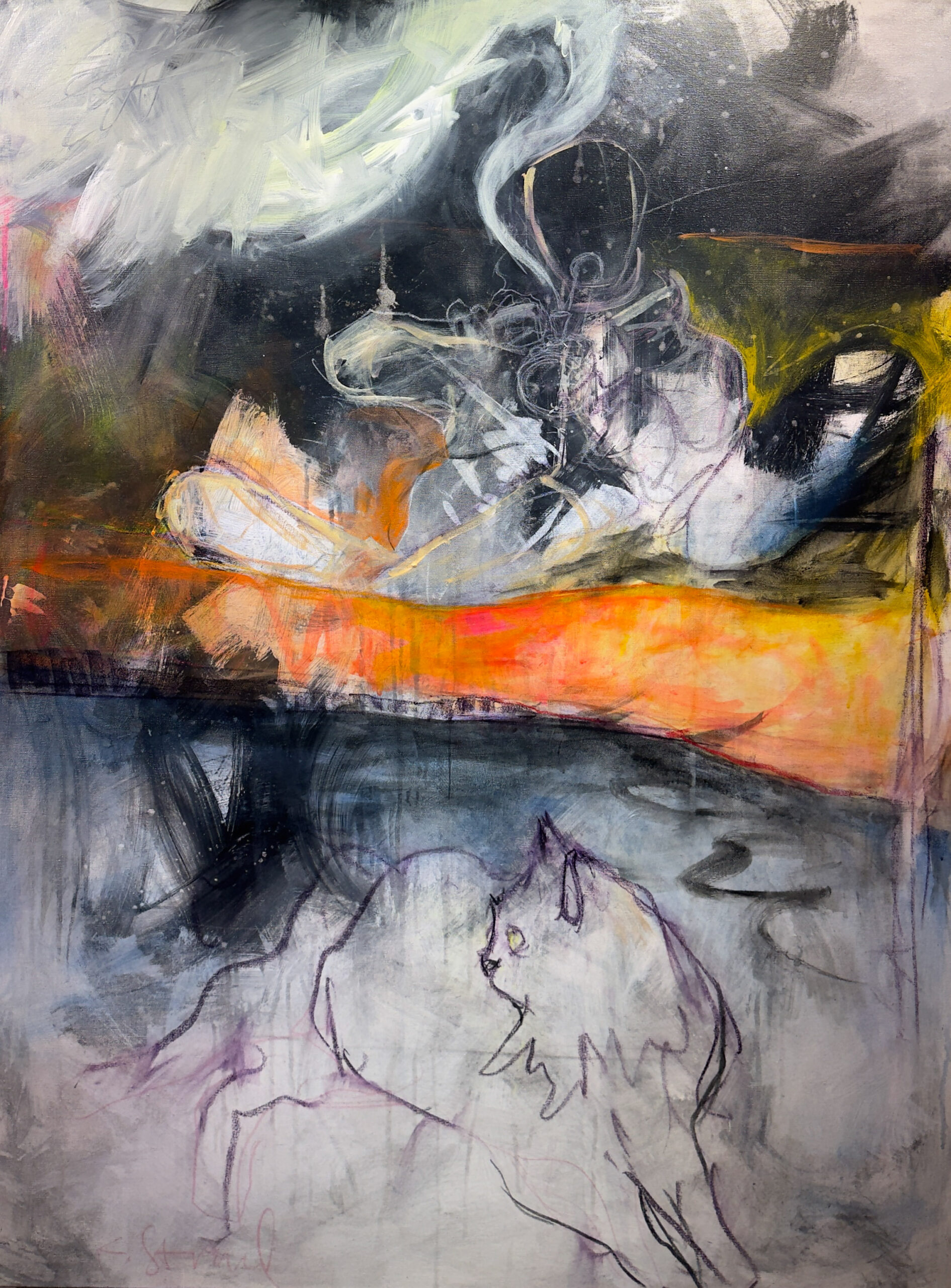 Strand’s paintings explore the sensory fields of land, sky, water, and the body — spaces where gesture, color, and breath converge. Through brushwork, line, and layered surfaces, form emerges intuitively, often suggesting terrain that is both landscape and flesh — atmosphere carries emotion. In her recent botanical cannabis series and smoking still lifes, Strand continues this inquiry into intimacy and perception. The plant is rendered not as an object but as presence, smoke becomes another kind of landscape: ephemeral, drifting, and bodily, echoing the rhythms of breath and release. Strand works primarily in acrylic, aerosol, charcoal and chalk pastel on canvas or board, allowing the materials to guide the process. She embraces accidents, unfinished edges, and impulsive marks as a way of discovering the painting rather than controlling it. Her work exists between realism and abstraction, where sensation takes precedence over representation. Ultimately, Strand’s paintings invite viewers inward — to inhabit the space between form and feeling, to breathe with the work, and to encounter landscapes as emotional and physical terrain.