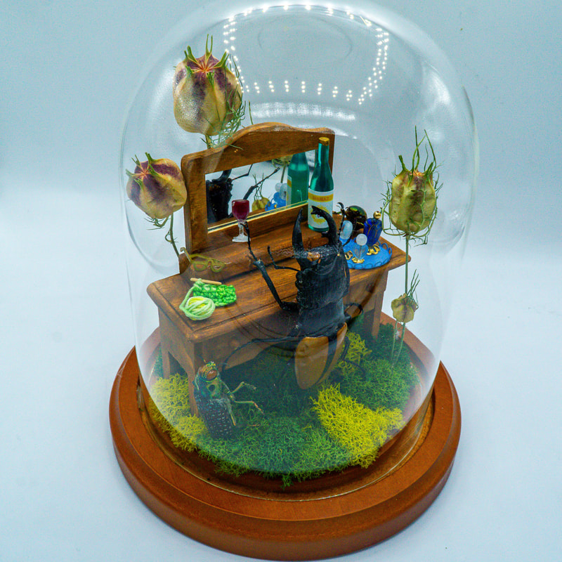 Enter a land of whimsical yet peculiar miniatures populated by colorful beetles and lost treasures. Seymour creates tiny worlds living under glass domes that imagine encounters between the natural and human worlds. Beautiful beetle specimens covet an itty bitty ouija board, roll a D20 die, or contemplate a misplaced toy. In other pieces, the roles are reversed and tiny, scale model people encounter enormous beetles of questionable hospitality. Visions of the apocalypse or the just world beneath our feet? It’s up to you to decide…