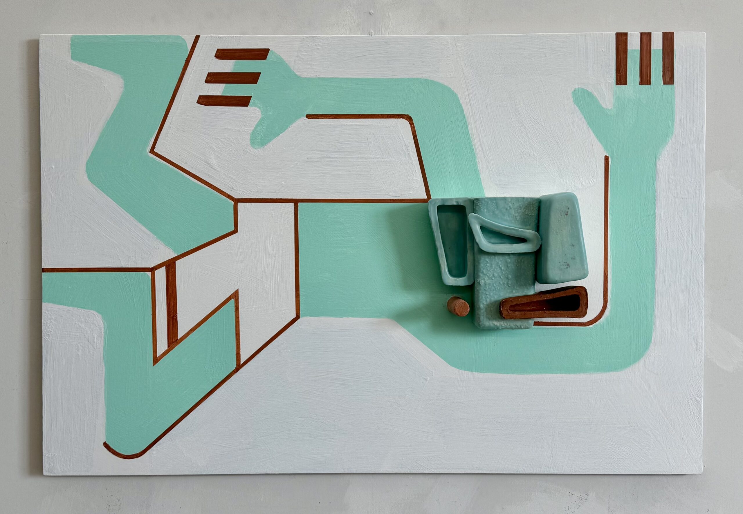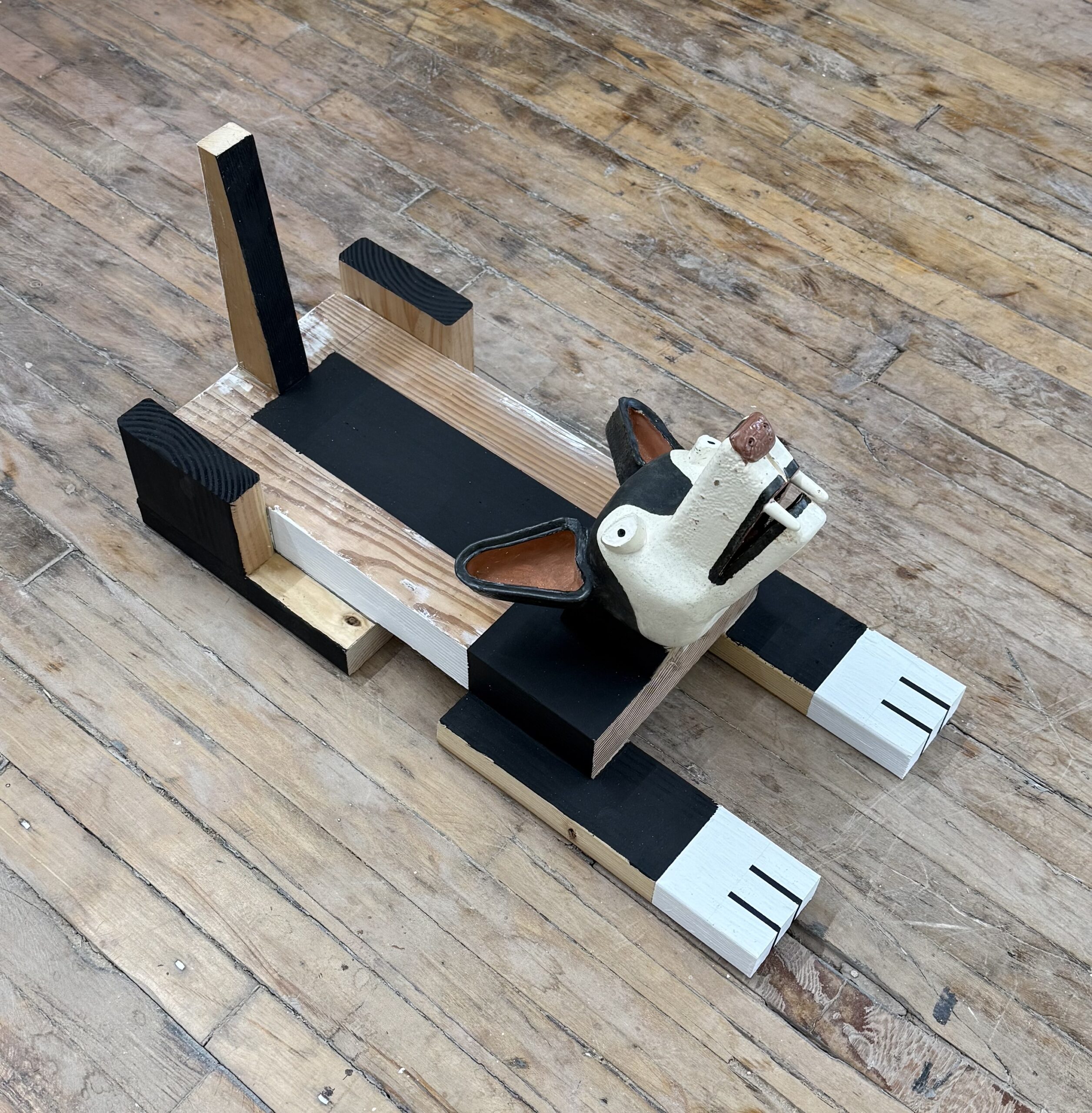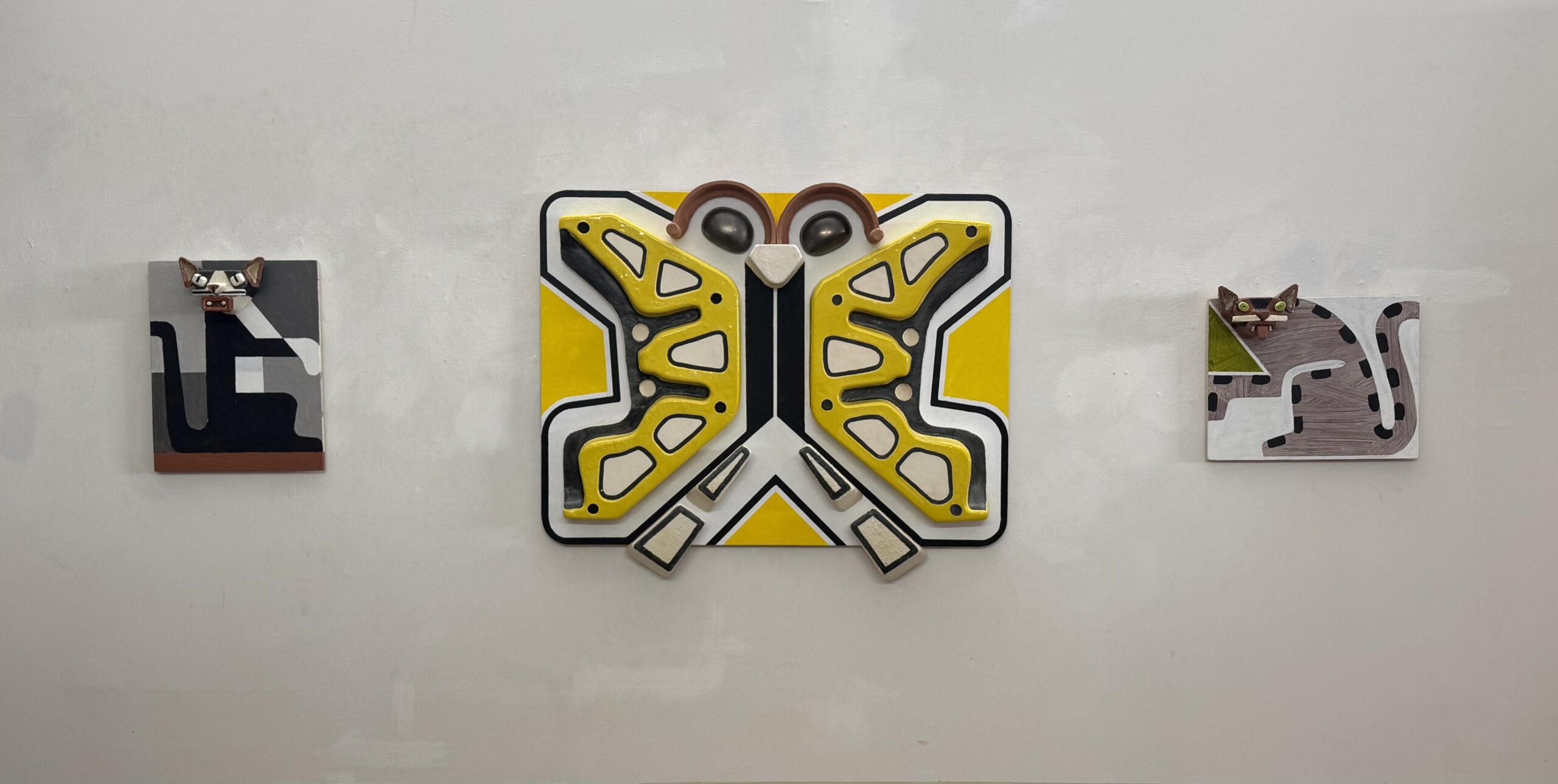 Animal heads and Mesoamerican deities are cast from ceramic slip. These are combined with two dimensional panels forming bodies.